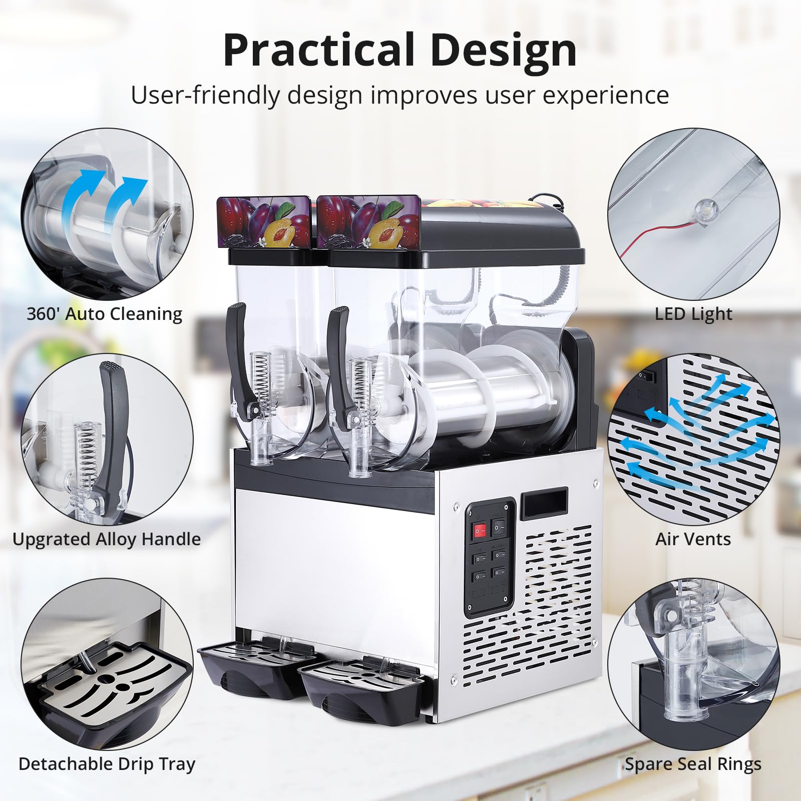 Our slushy machine doesn't just perform well; it looks great too! The sleek stainless steel design adds a touch of professionalism to any setting. The built-in light not only enhances its appearance but also allows for easy monitoring of the beverage-making process, ensuring perfect results every time.
