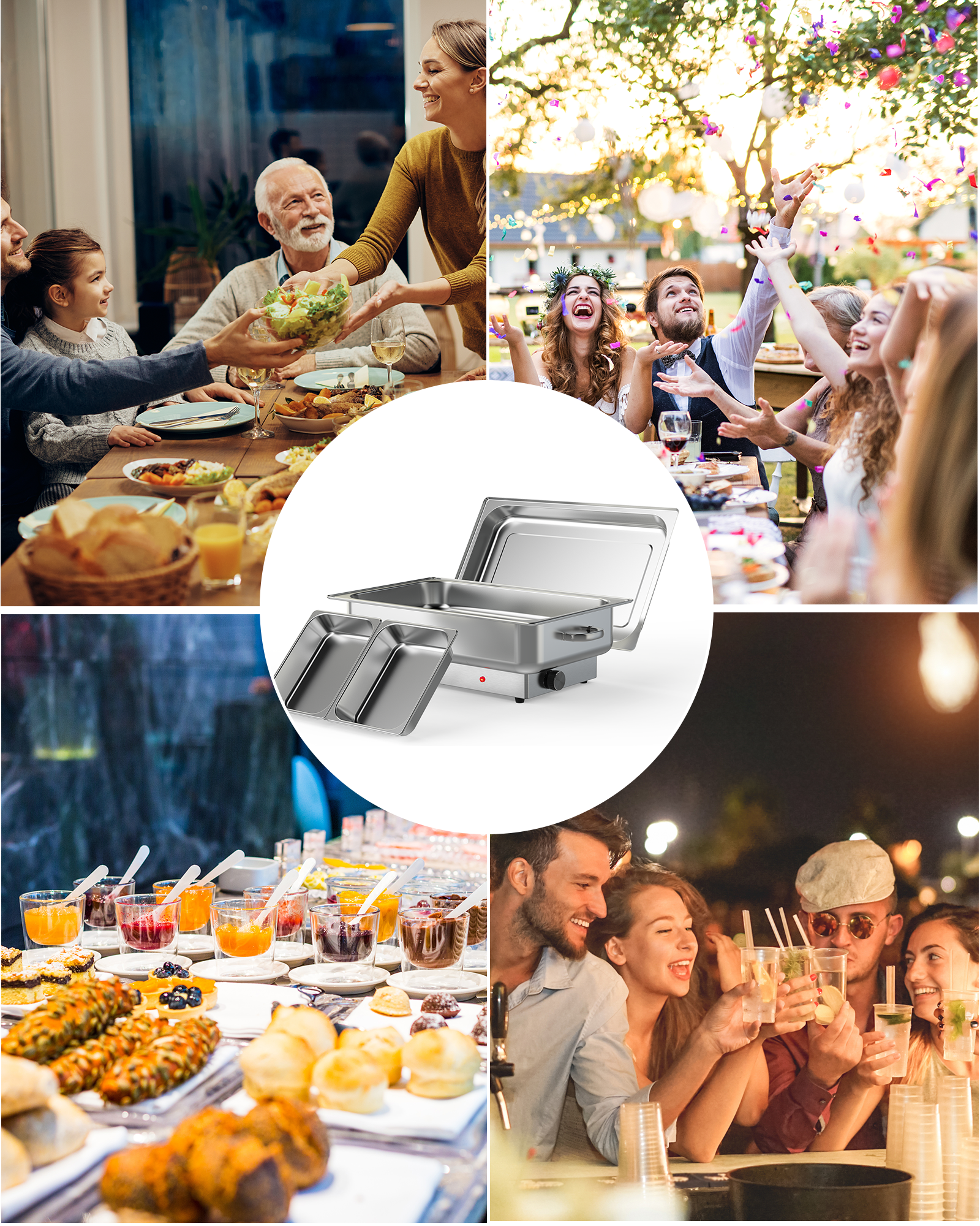 The electric chafing dishes are suitable as food warmers for parties, buffet servers, and warmers for catering events, restaurants, hotels, holiday gatherings, wedding brunches, etc.