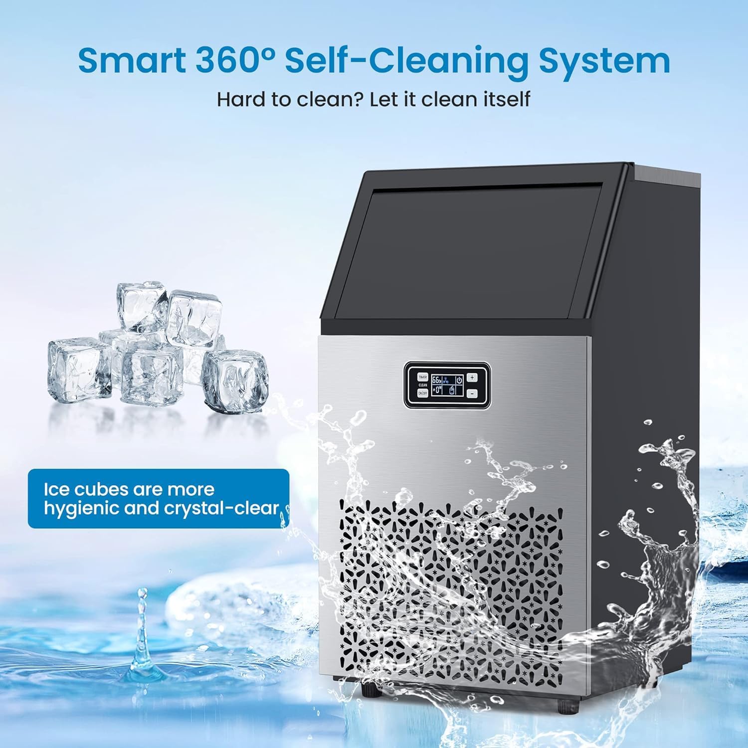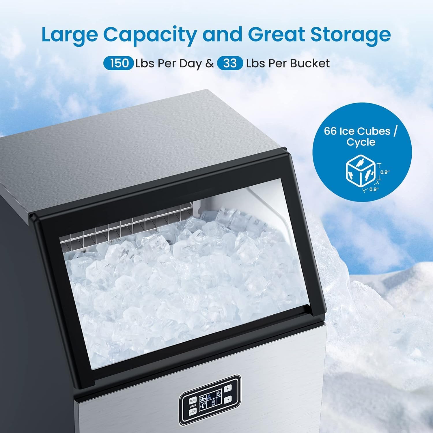 【Commercial Ice Machine】: Our commercial ice maker with high performance compressor can produce 150 pounds of square ice in 24 hours and store 33 pounds of ice at a time. Each batch of 66 ice cubes can be completed in 5-15 minutes, no need to worry about running out of ice. Each ice cube is at the standard size of 0.9"*0.9"*0.9", making it suitable for mixed drinks or small water bottle openings.