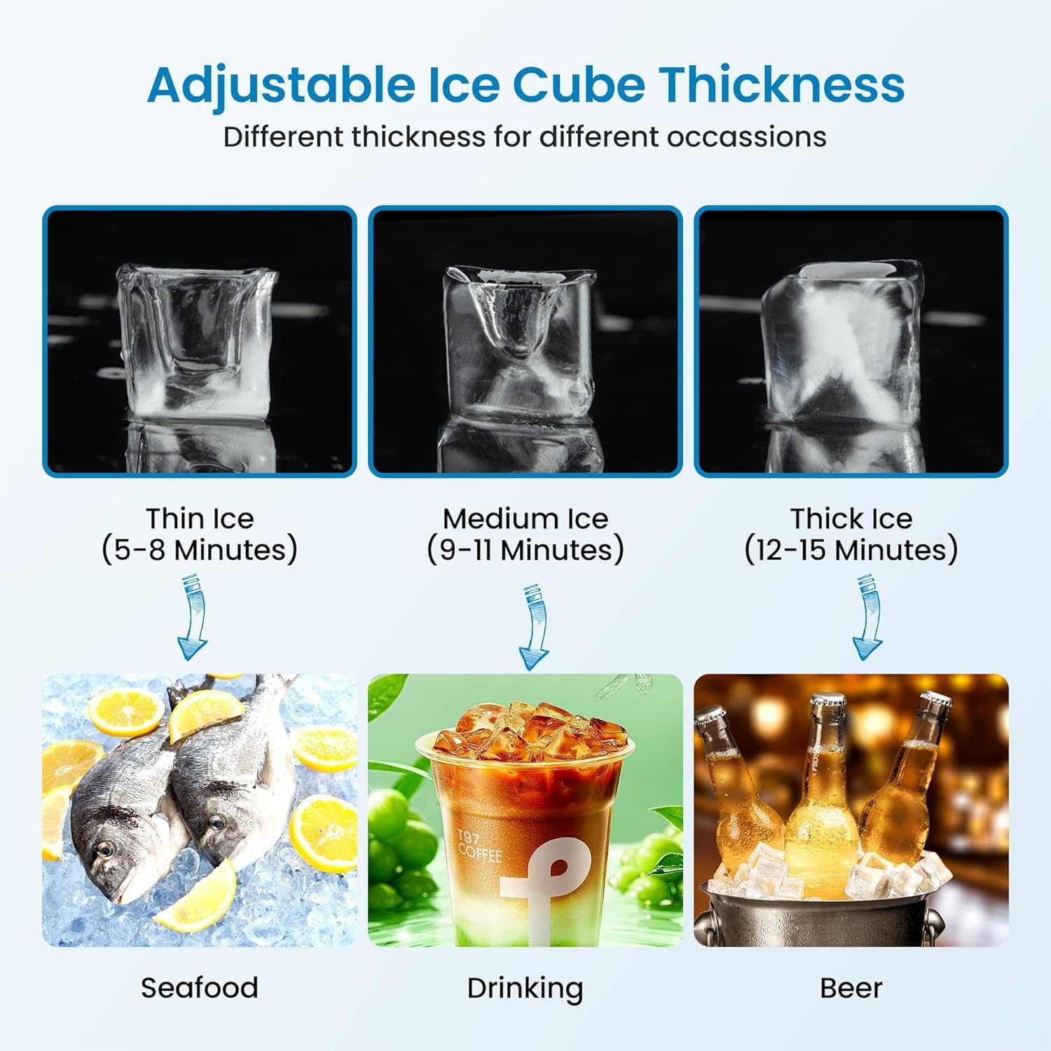 【Easy to Operate】: The commercial ice machine is designed to be easy to operate with a simple panel that allows you to adjust the timer to produce thin, medium or thick ice. In addition, an alarm sounds when the water runs out to remind you to refill the machine. A self-cleaning feature is also included to help keep the under counter ice maker working properly.