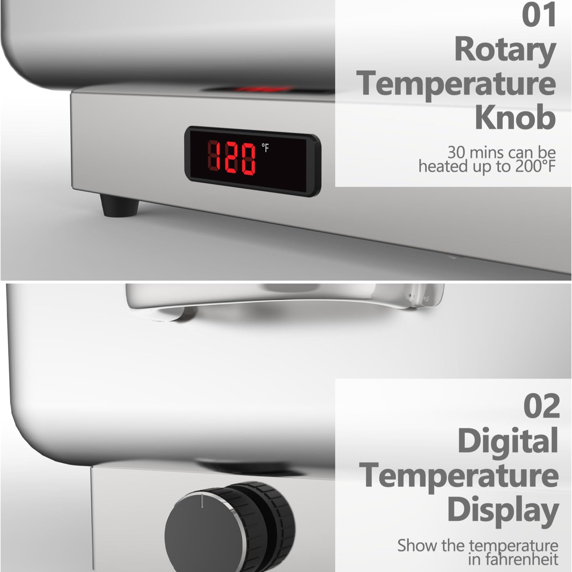 - 【Adjustable Temperature Control】The electric buffet servers and warmers have a digital control panel and temperature display, so you can easily read and adjust the temperature. Great for keeping food at the perfect serving temperature. The stainless steel chafing dish can adjust the temperature from 86°F and 200°F(30°C and 93°C) to keep food warm.