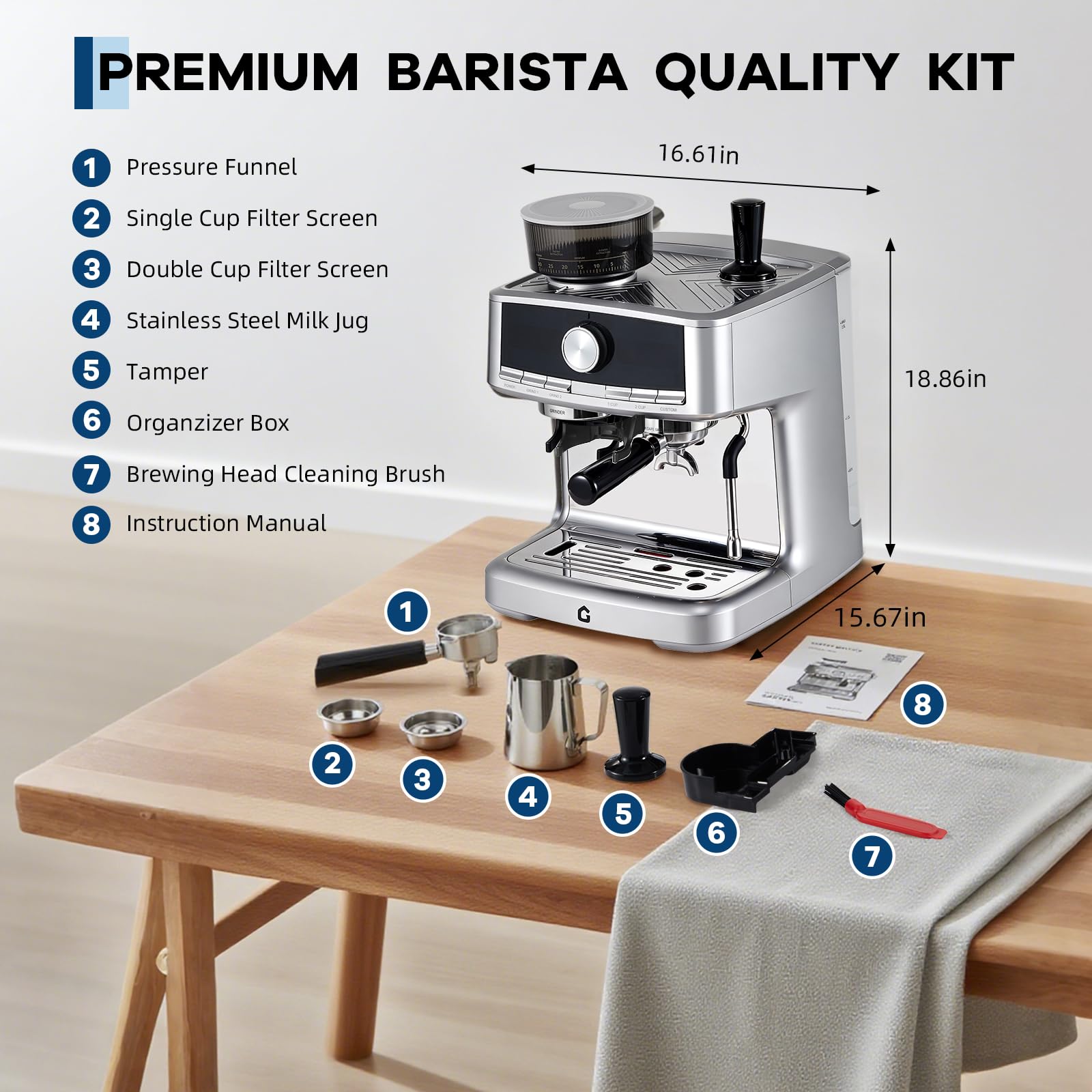 Garvee 20 Bar Pressure Espresso Machine with Grinder, Milk Frother for Home/Office, 1.5L Removable Tank, Silver