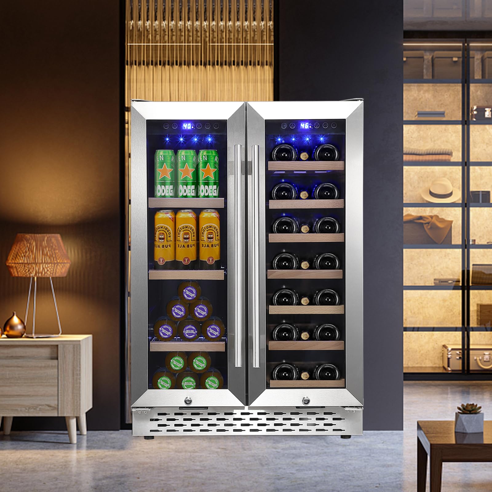 Separate temperature controls for wine and beverages ensure optimal storage conditions for different drink types.