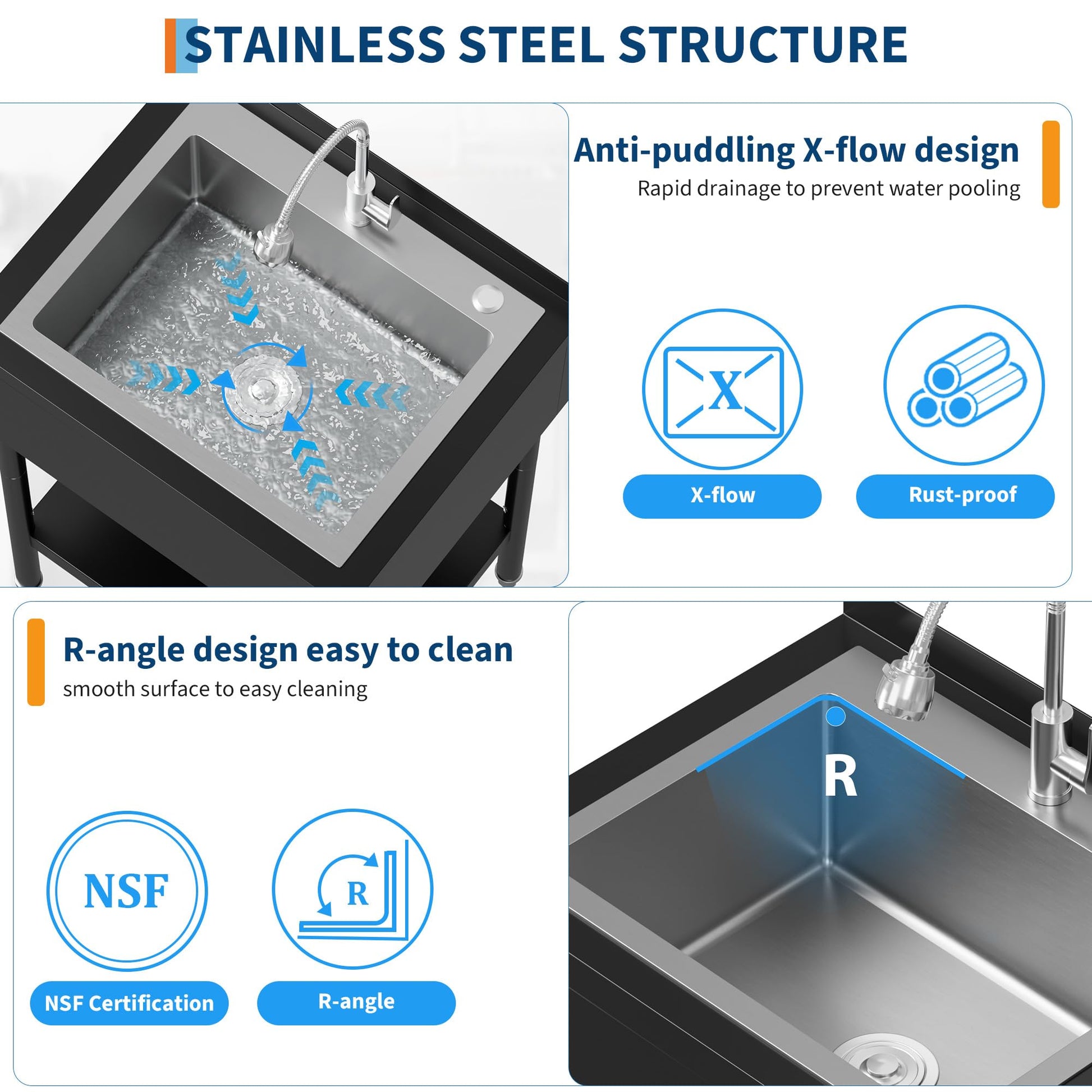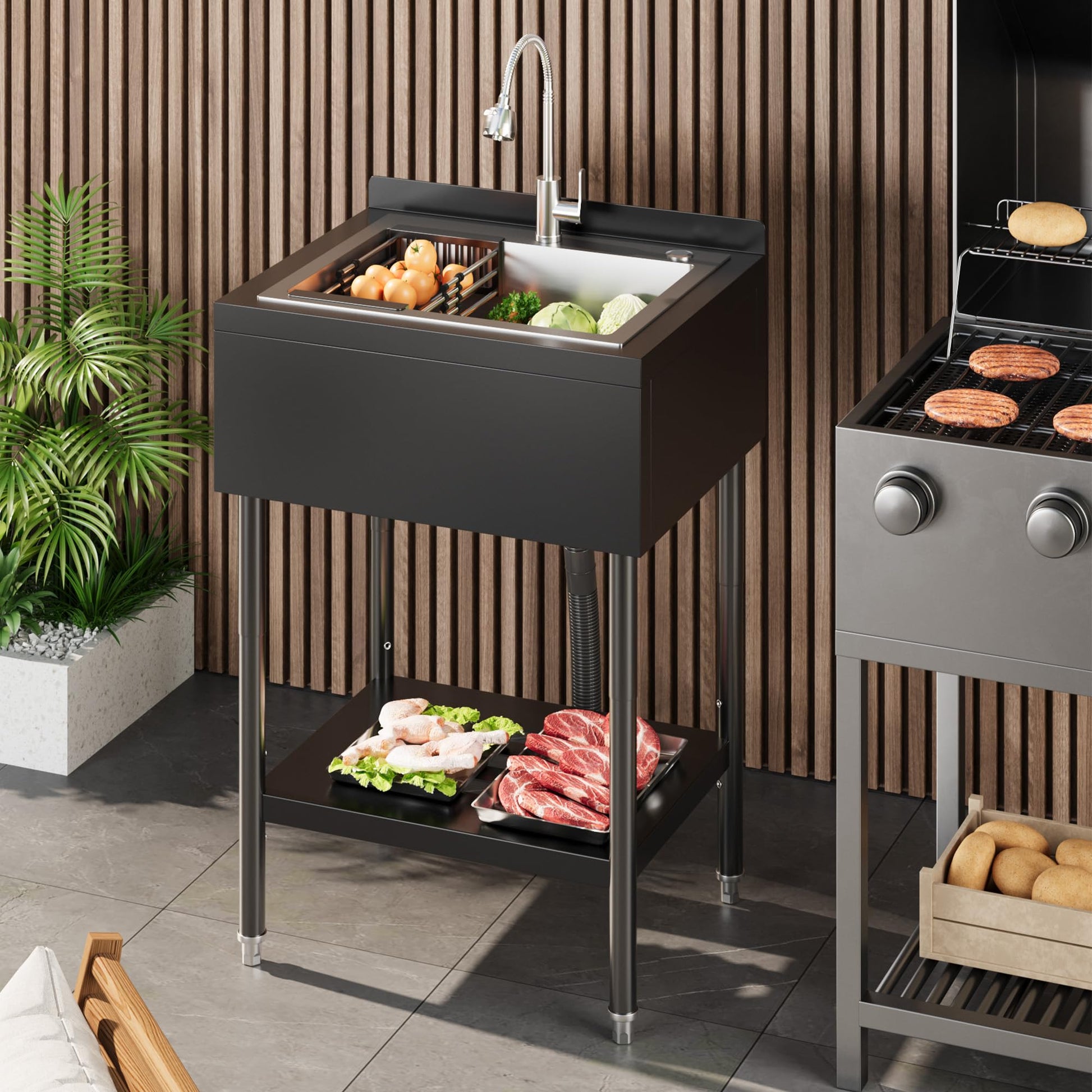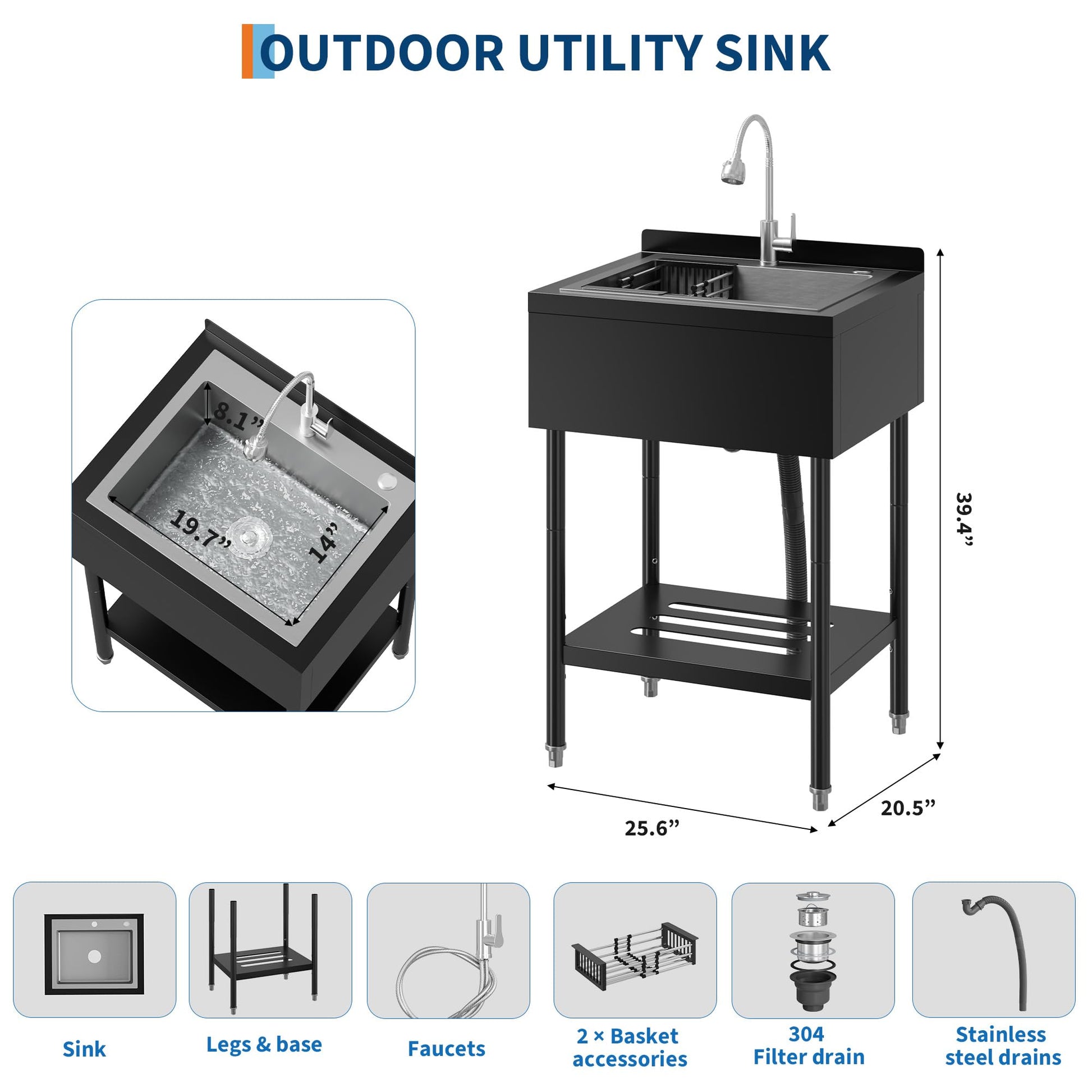 Garvee 21"D X 26"W X 40"H Commercial Stainless Steel Utility Sink With Hot & Cold Water Faucet, Drain Basket For Indoor & Outdoor Use, Black