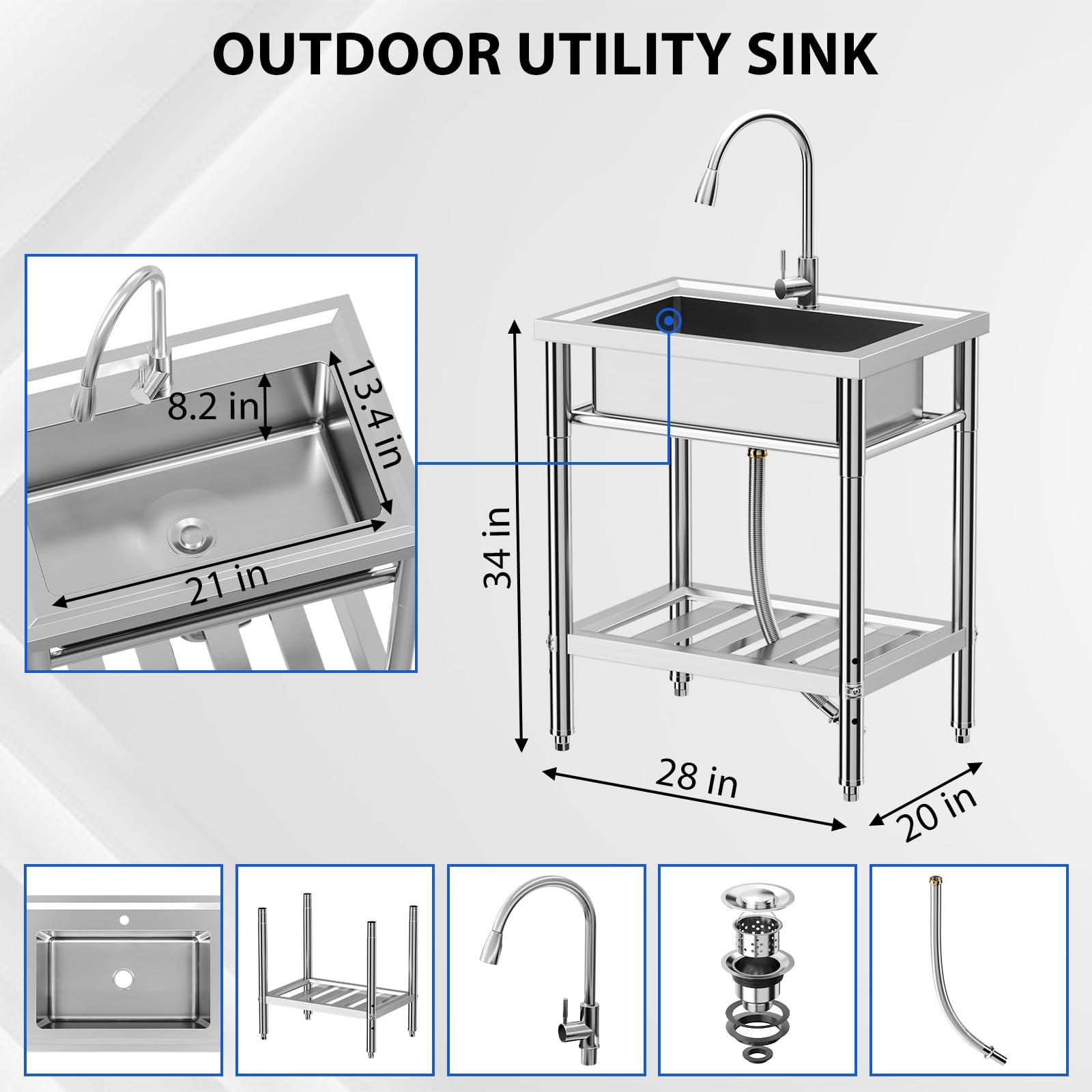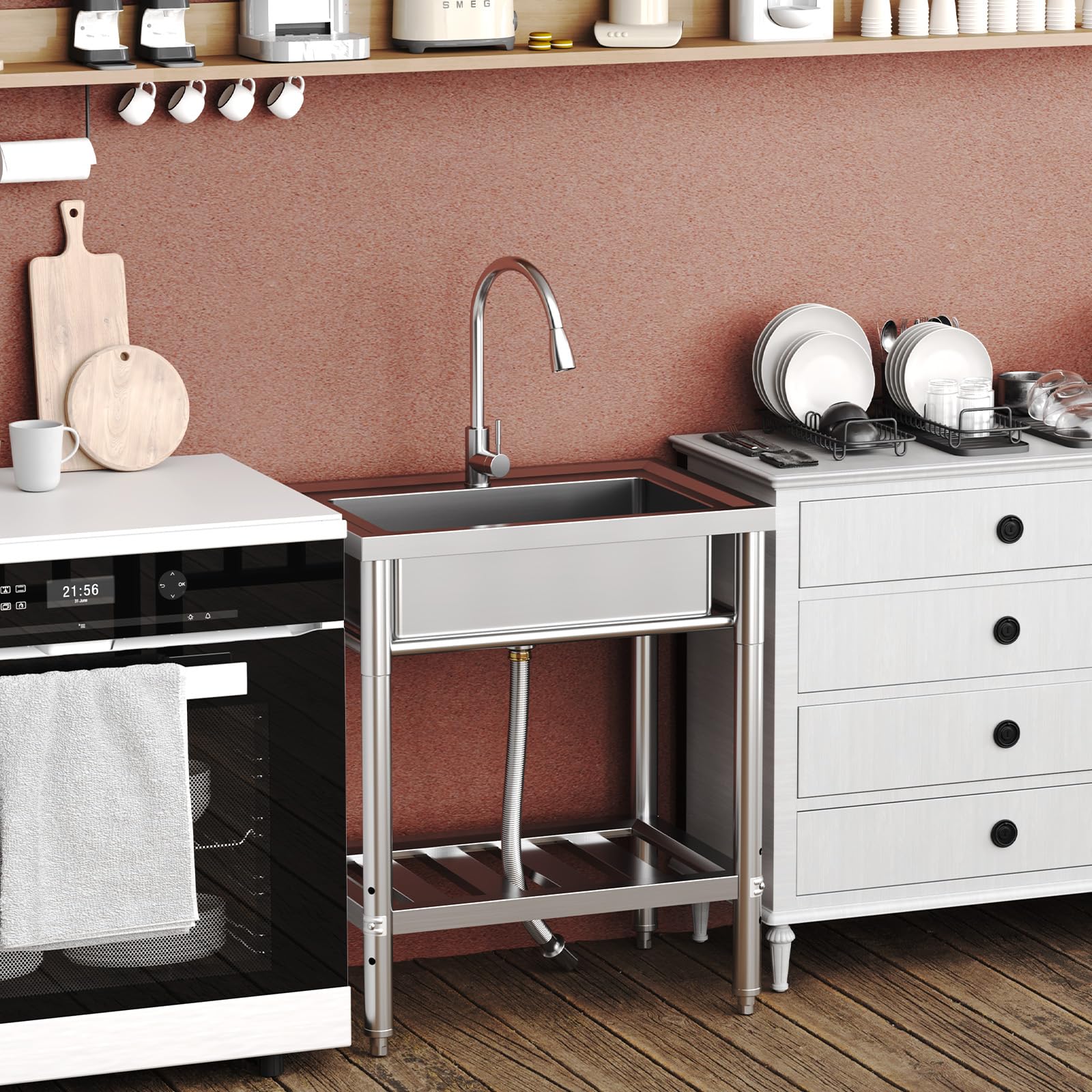 Garvee 28"W x 20"D x 34"H Freestanding Stainless Steel Single Bowl Kitchen Sink - 360° Rotating Faucet, Storage Shelf, Adjustable Legs, and Hot & Cold Hoses for Commercial Use