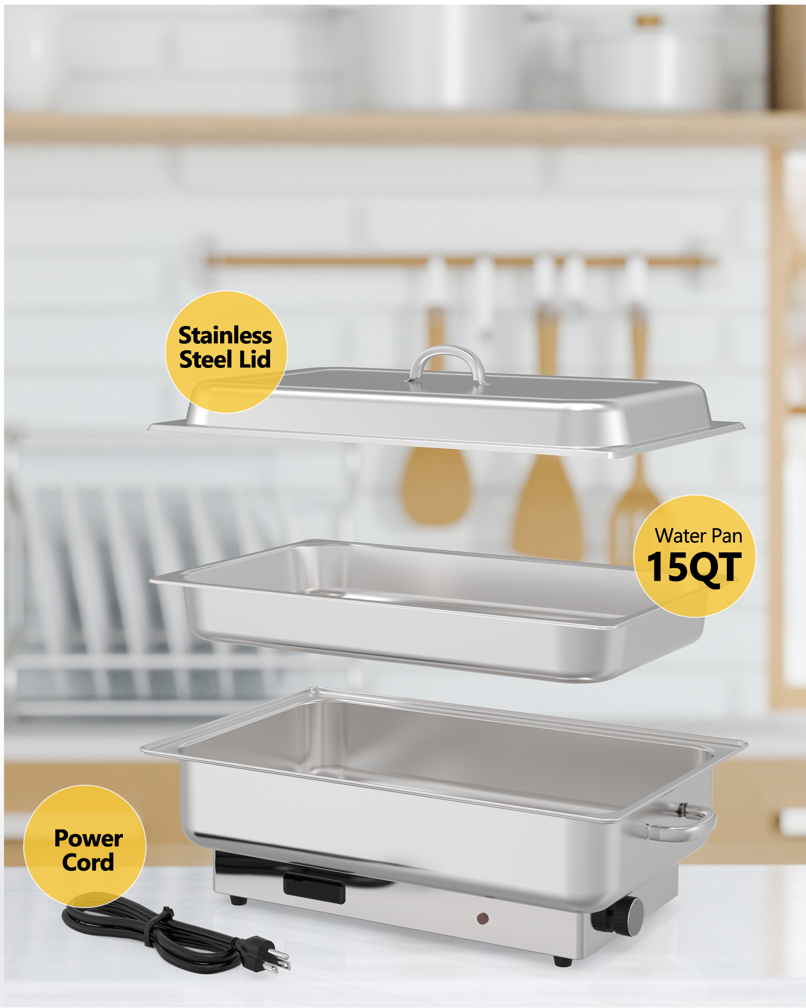 The electric chafing dishes are suitable as food warmers for parties, buffet servers, and warmers for catering events, restaurants, hotels, holiday gatherings, wedding brunches, etc.