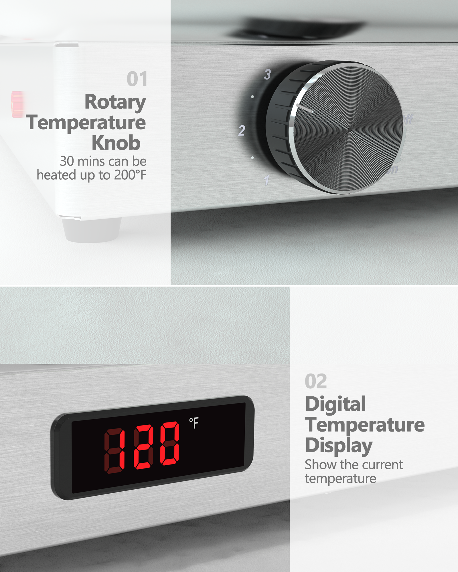 Powered by a 400W built-in heating element, after filling the water pan with water, the thermostat can be easily adjusted between 86°F and 200°F (30°C and 93°C) to meet your food service requirements, ensuring low power consumption and higher efficiency.