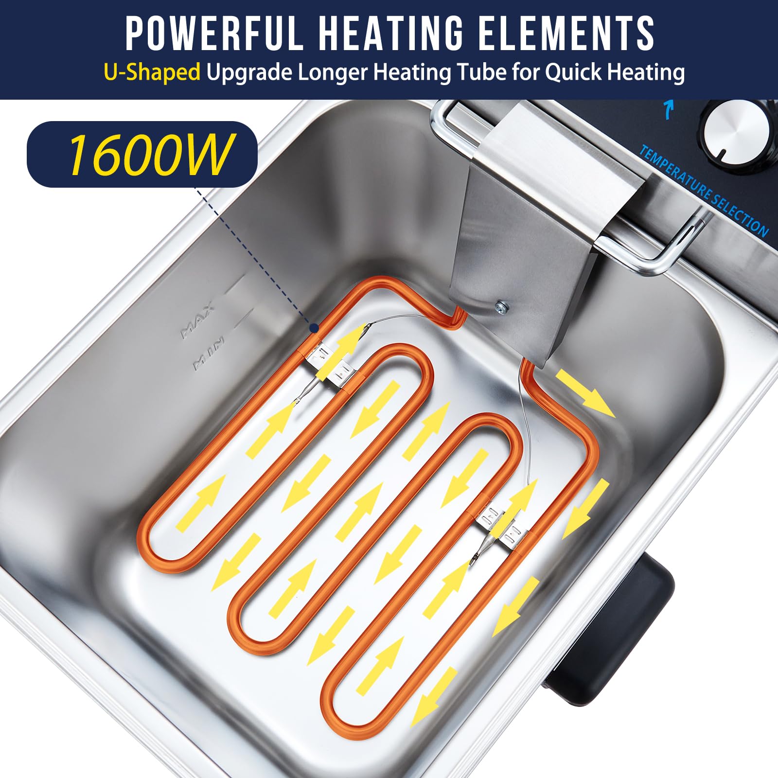 1600 Watts multi-ring heating tubes for quick and even frying.