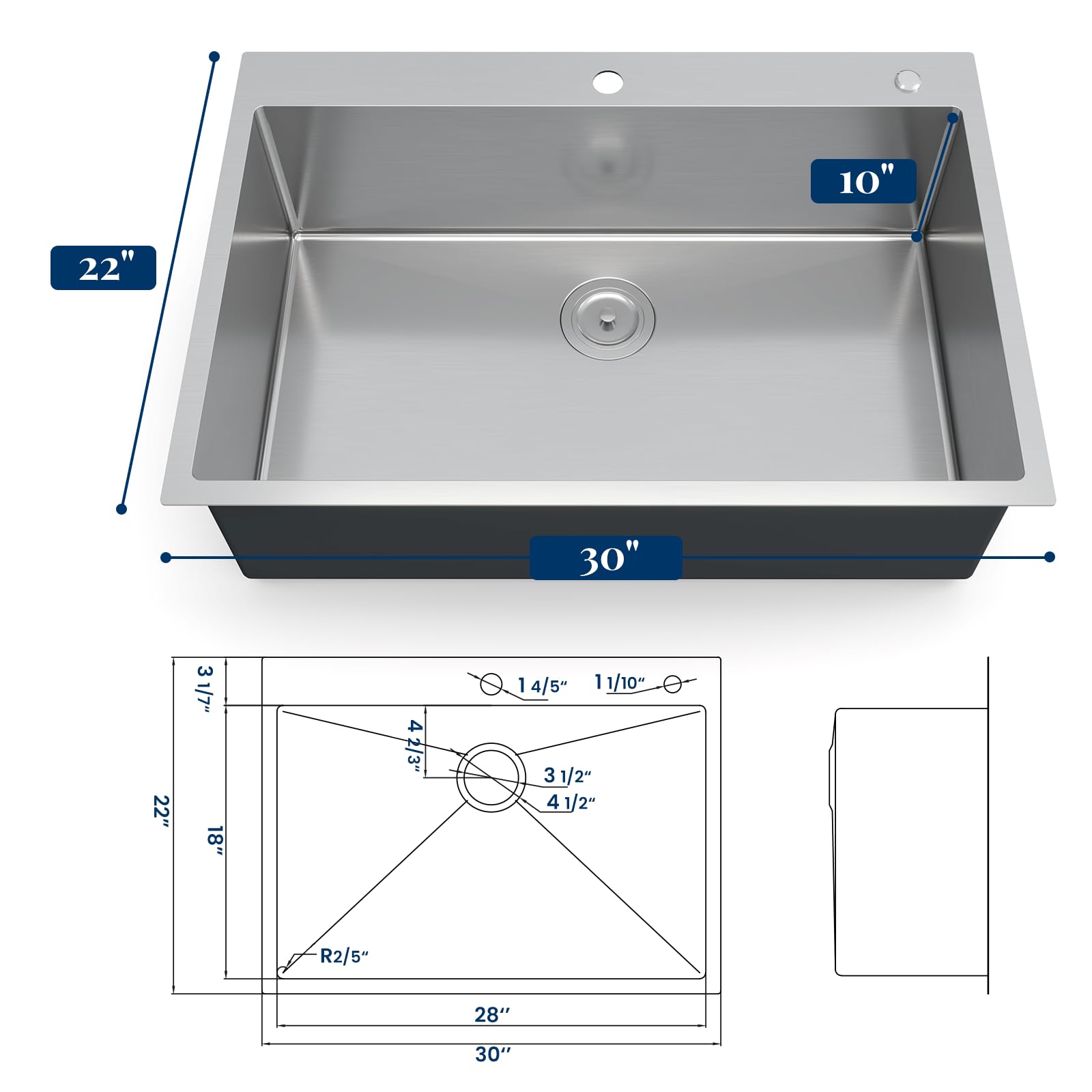 This R10 tight radius round corner sink with gently rounded corners for easy cleaning up and maintenance. Constructed by 16 Gauge(1.5mm thick) brushed nickel finished T304 stainless steel for exceptional resistance to corrosion, rust, and long-lasting.