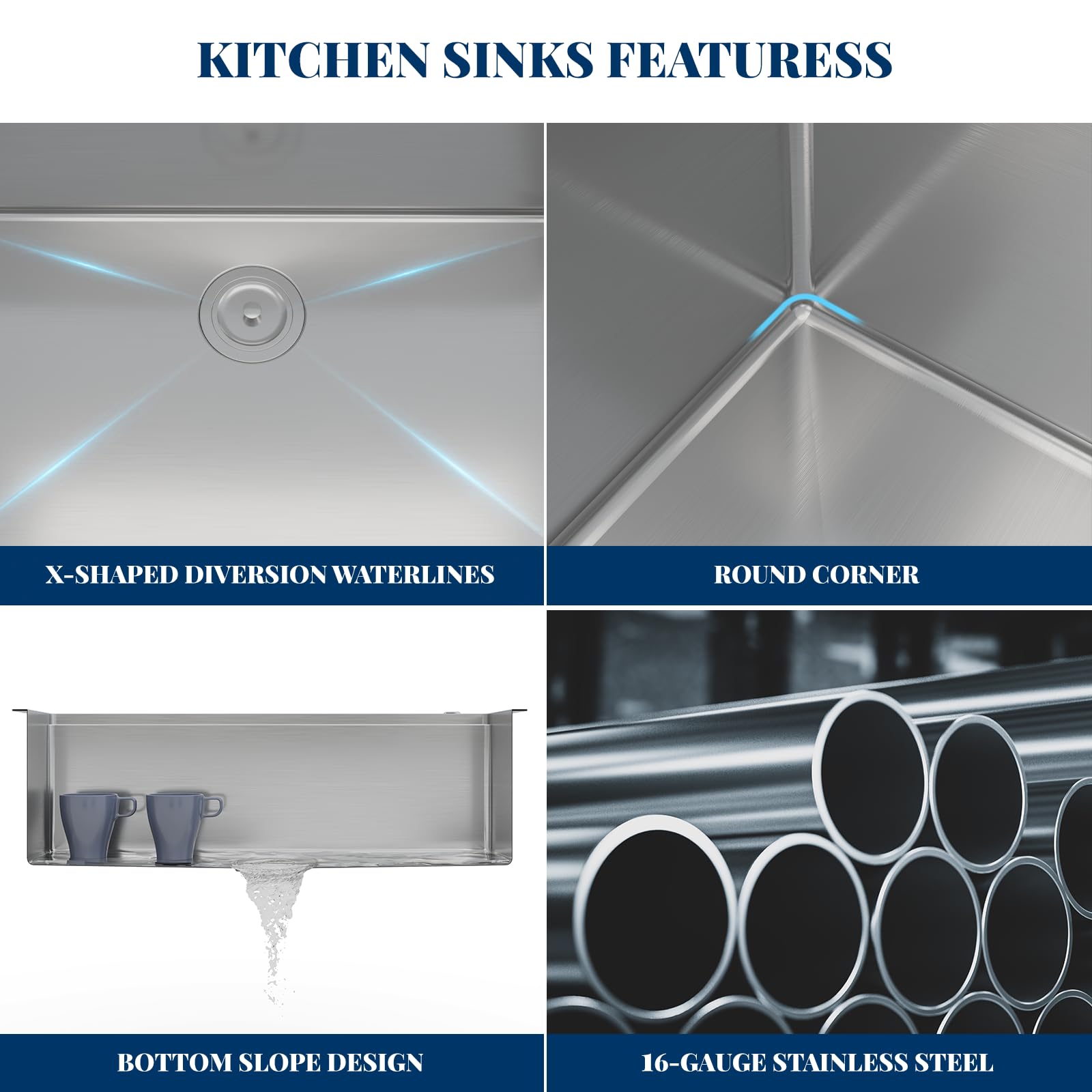 Noise Reduction: 3mm sound guard undercoating and thick rubber padding to minimize noise. This kitchen sink boasts tougher bulk, finer details, greater capacity.