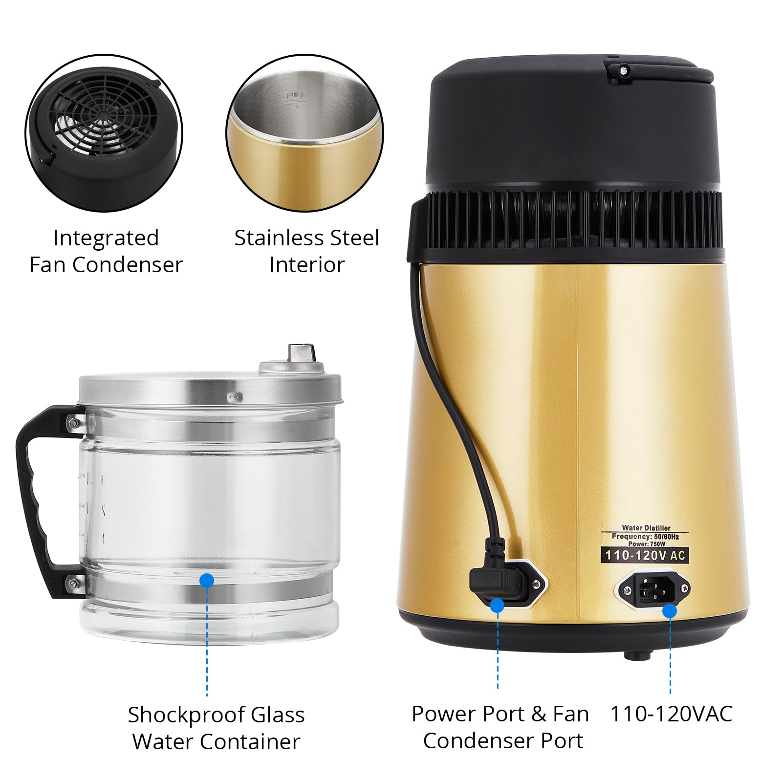 Garvee 4L Water Distiller Stainless Steel Distilled Water Purifier Countertop Home Use Golden