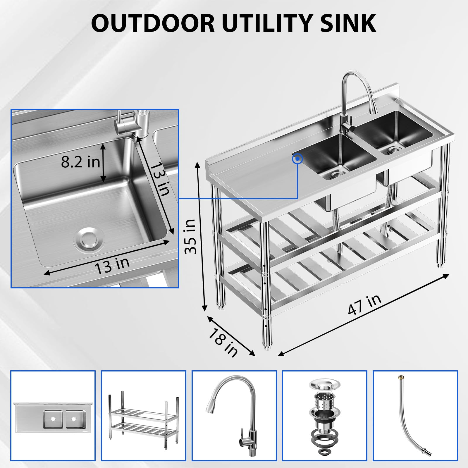 GARVEE 47"x18"x35" Stainless Steel Double Bowl Utility Sink with 360° Rotating Faucets High-Quality Build Ideal for Restaurant Garage Outdoor Cleaning Tasks