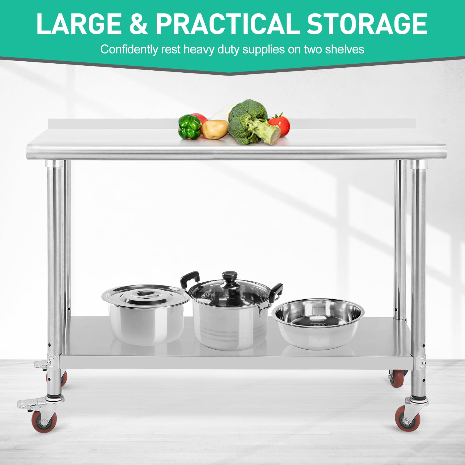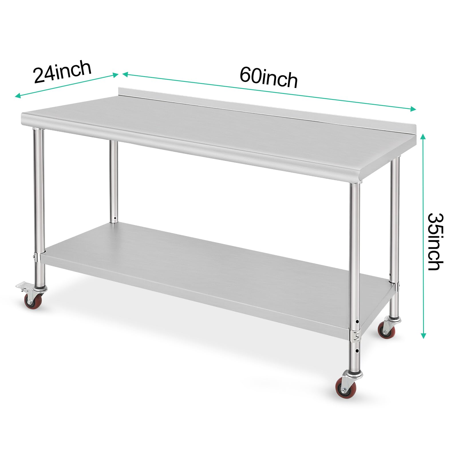 Garvee 60"L x 24"W x 35"H Stainless Steel Work Table with Wheel and Backsplash, Heavy Duty Metal Table Cart Worktable, Commercial Workstation for Restaurant, Home and Hotel